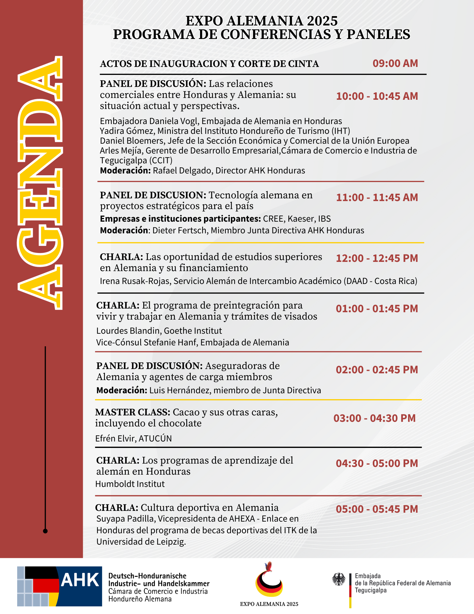 Es un evento integral que combina negocios, educación y cultura, posicionando así a Alemania en la mente como una nación con diversidad de oportunidades atractivas para las empresas, los profesionales y los jóvenes hondureños. Este espacio está diseñado para conectar a Honduras y Alemania logrando que el público hondureño descubra los productos y servicios de calidad «Made in Germany» que están ya en el mercado; para que empresas hondureñas con potencial y con vínculos con el mercado de Alemania divulguen sus productos y entren en una dinámica enriquecedora de acercamientos, ofertas, exploración de nuevas rutas de cooperación económica con la amplia gama de empresas, instituciones privadas y públicas presentes en el recinto de exposición. Expo Alemania 2025 ofrece un programa de charlas y paneles de expertos que ahondará en ese enorme espacio de posibilidades que se abre entre Honduras y Alemania.